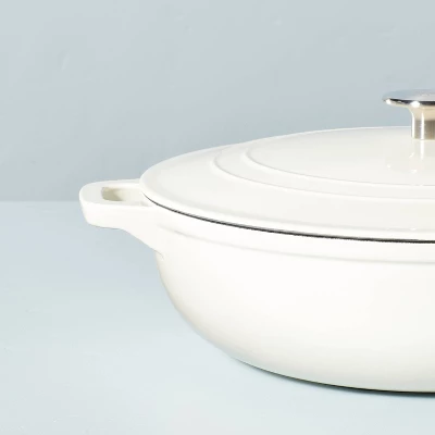 Upgrade your cookware in practical but pretty style with this 5.3-Quart Enameled Cast Iron Braiser from Hearth & Hand™ with Magnolia. Made from cast iron with an enamel finish, this braiser features extended handles for convenient lifting after cooking, making it easy to transport dishes from kitchen to tabletop for convenient serving. The 5.3-quart pot comes complete with a matching lid for covered cooking and storage, and the versatile sour cream color coordinates easily with a variety of cookware, serveware and table linens.