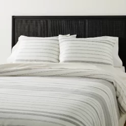 The Alternating Pinstripe Comforter & Sham Set from Hearth & Hand™ with Magnolia offers an elegant way to add textural interest to your bedroom. This comforter set includes a soft-filled comforter with alternating gray pinstripes on a cream background for a versatile look that can be incorporated into any decor theme. A matching pillow sham with a six-inch inner envelope completes the bedding set for a cohesive, neat look. Made from a soft, breathable fabric blend, this comforter and pillow sham set brings you year-round comfort, while its machine-washable design makes for easy care — simply add your choice of sheets and decorative pillows to give the decor of any bedroom a stylish makeover.
